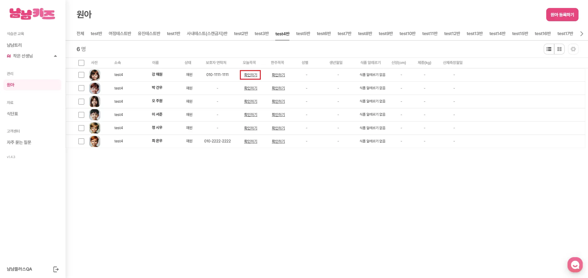 스캔 기록을 확인하고자 하는 원아명 칸에 있는 확인하기를 선택해주세요.