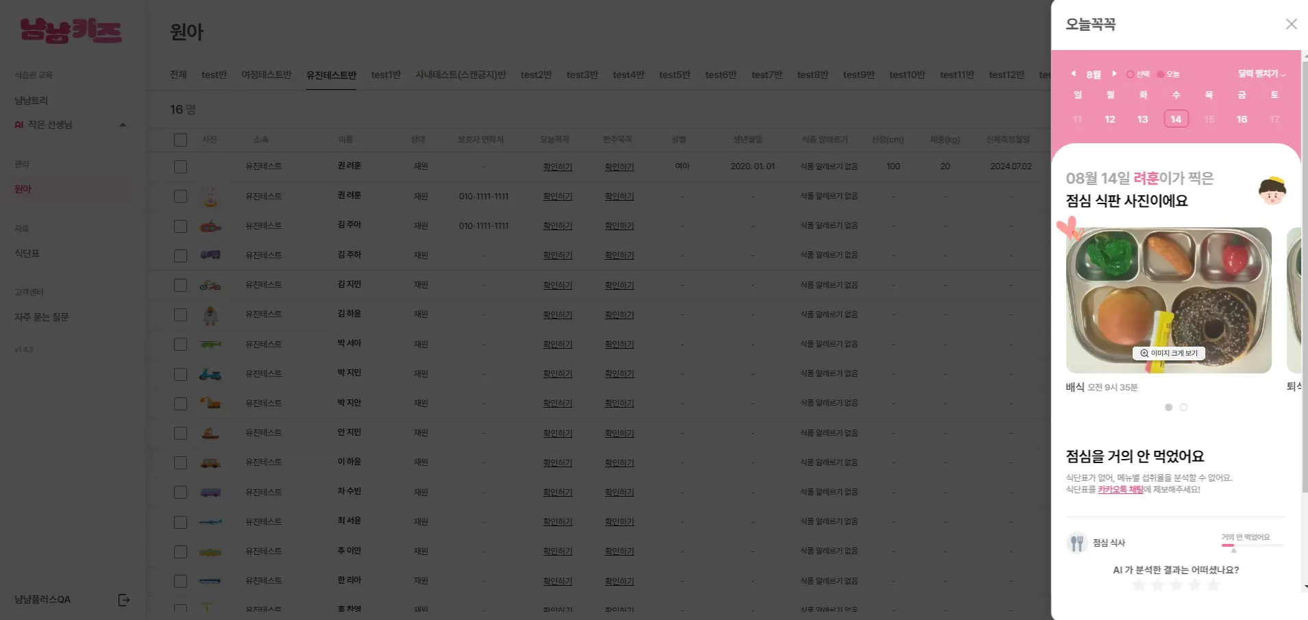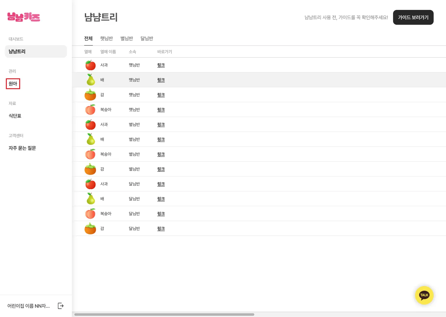실제로 보호자님에게는 제공되는 리포트에는 완밥 도장, 식품군 균형, 냠냠텃밭, 레시피 등 기능이 포함되어 있지만, 냠냠프로에서는 식판 사진과 스캔 시각, 섭취율만 확인 가능해요!
