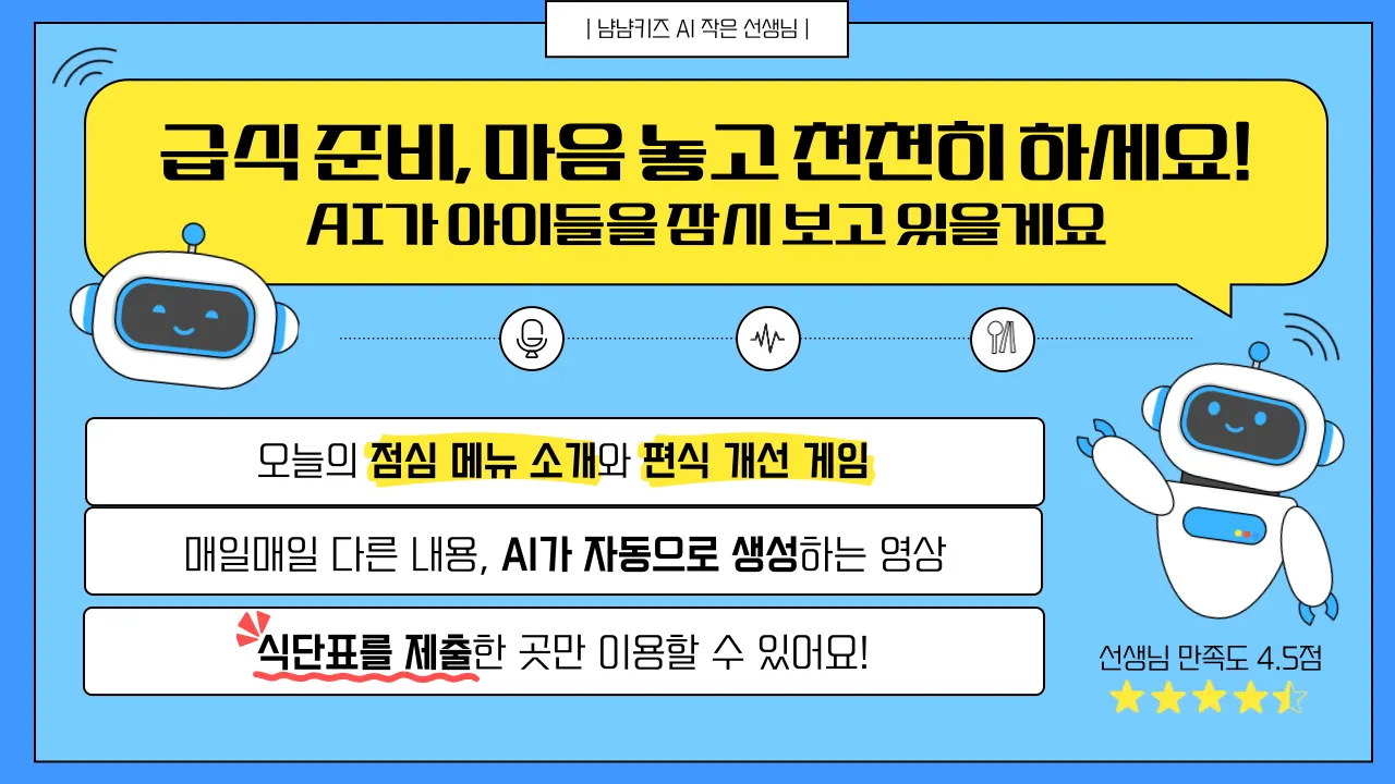 당일 우리 유치원/어린이집에서 제공되는 메뉴를 활용해, AI가 매일 다른 영상을 자동 생성해요