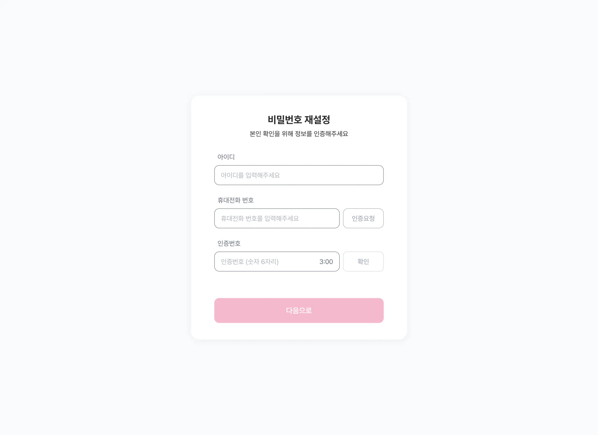 아이디 입력, 휴대전화 번호 인증 후 다음으로를 선택해주시면 비밀번호를 재설정 할 수 있어요.