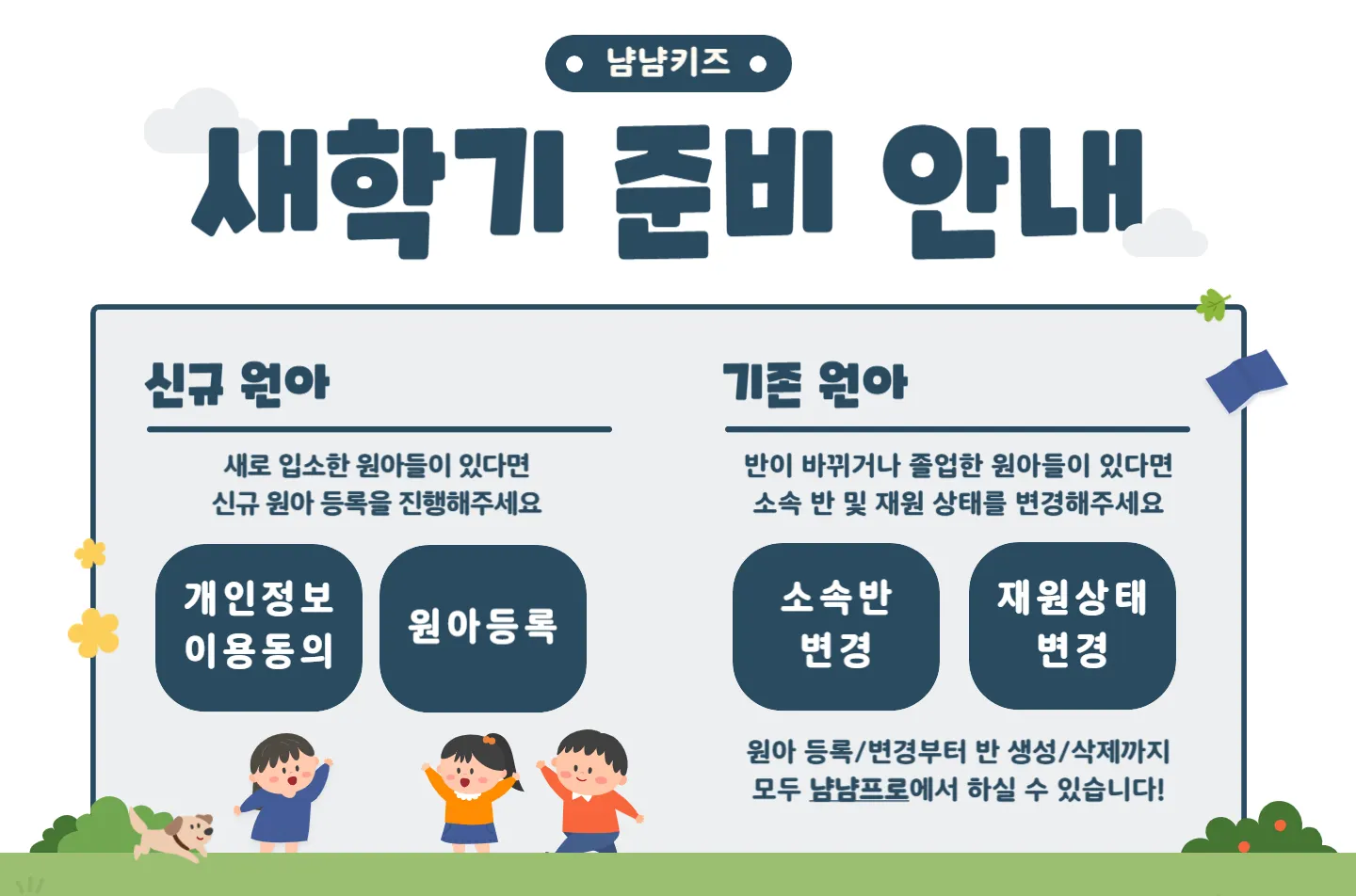 냠냠키즈 서비스를 처음 이용하시는 보호자 분들을 위해 키즈노트 등을 통해 냠냠키즈 서비스 운영 소식을 전달해주세요.