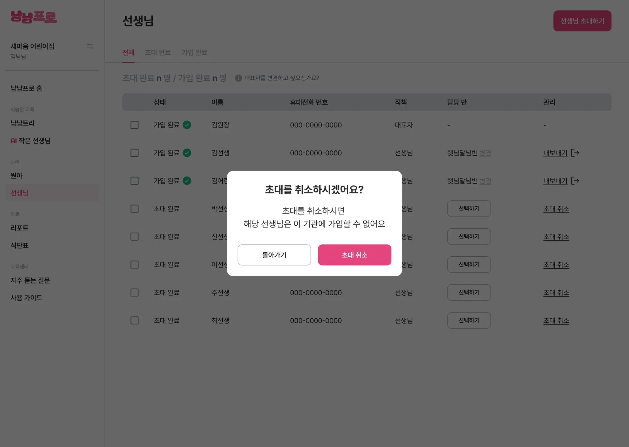 초대 취소 를 선택하시면 해당 선생님은 가입이 불가능해져요!