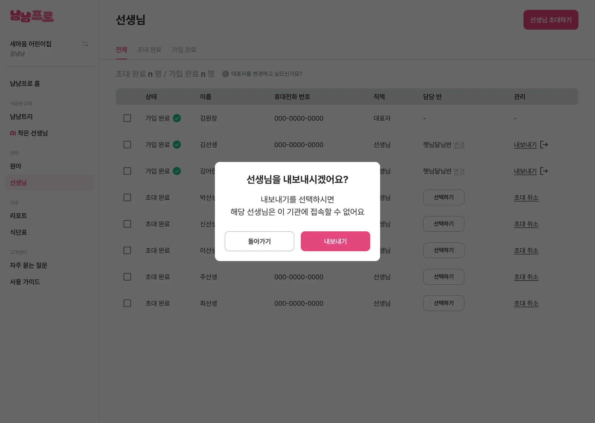내보내기를 선택하시면 해당 선생님은 로그인이 불가능해져요!