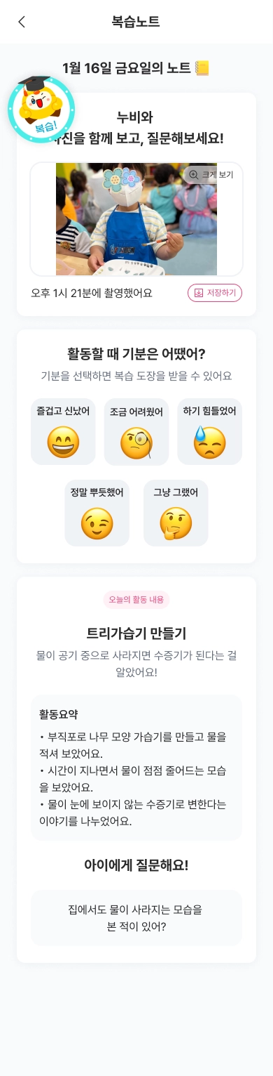 아이들의 활동을 선생님이 일일이 정리하지 않아도, 사진 한 장으로 자동 기록·전달해주는 복습노트를 준비했어요.