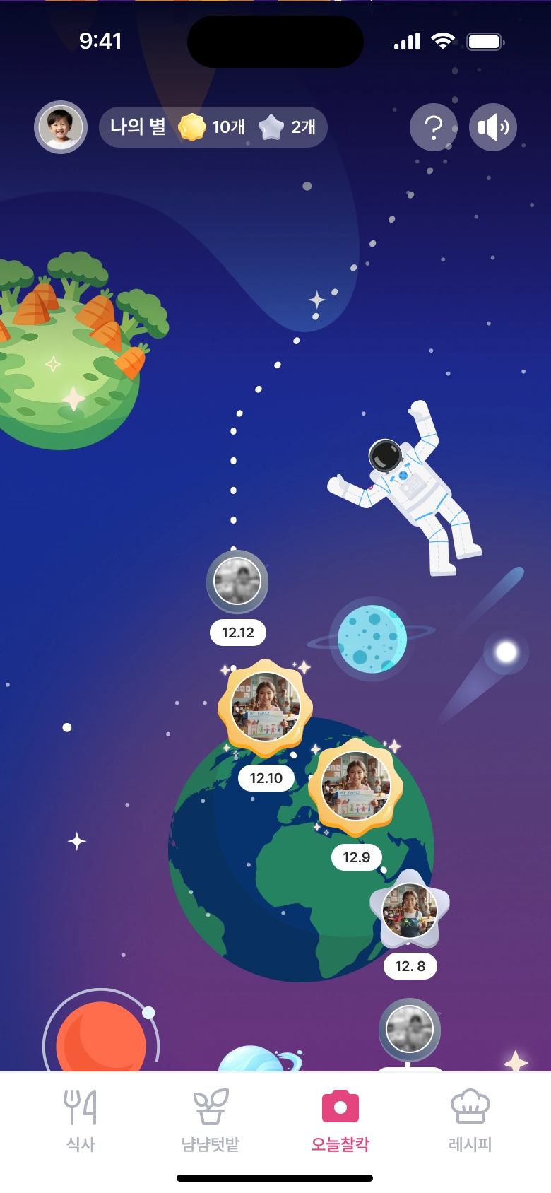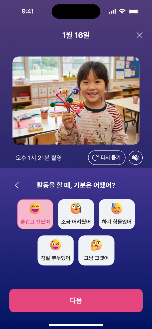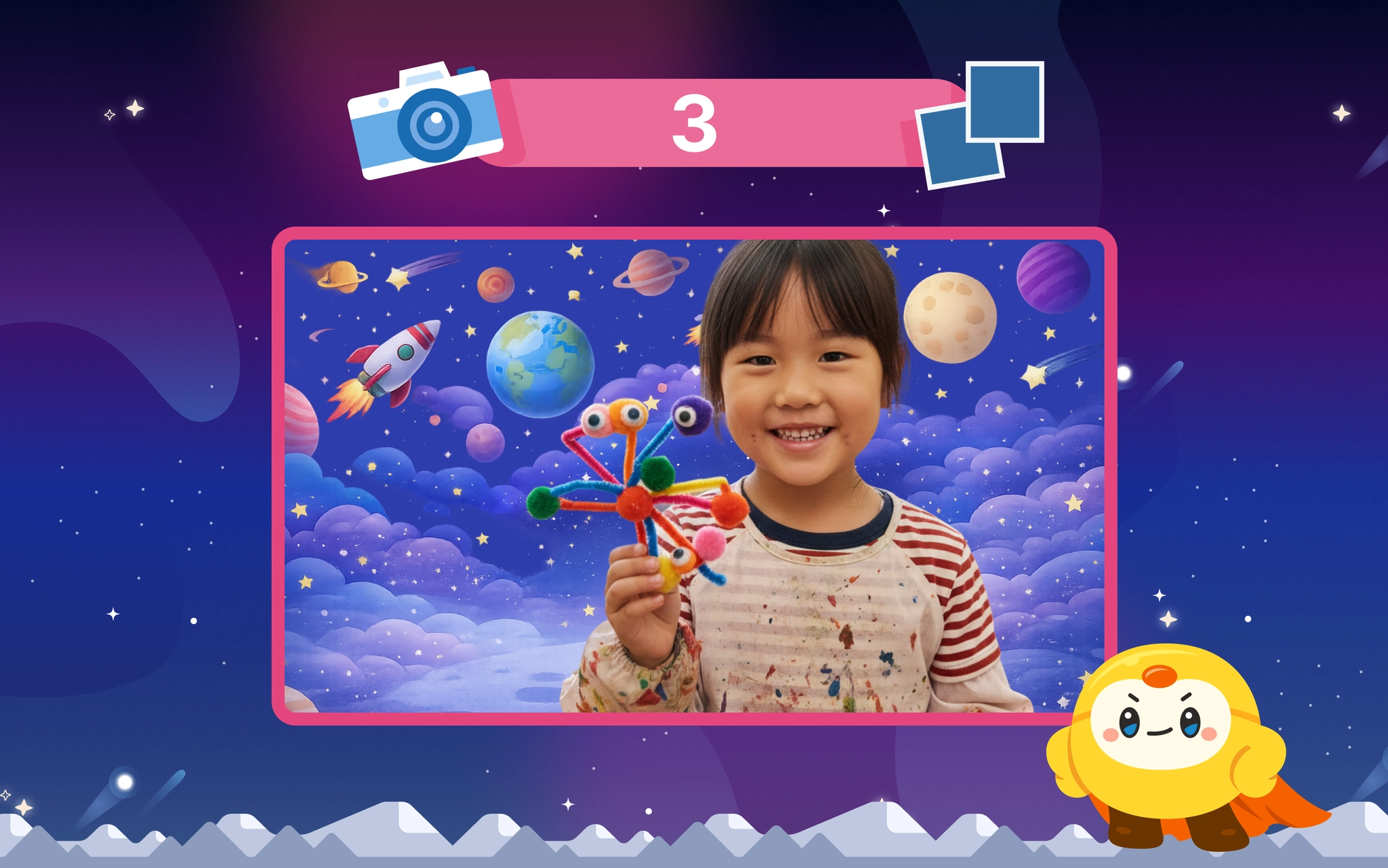 아이는 보호자와 함께 사진에 대해 이야기를 나누고 사진을 별로 빛나게 합니다.