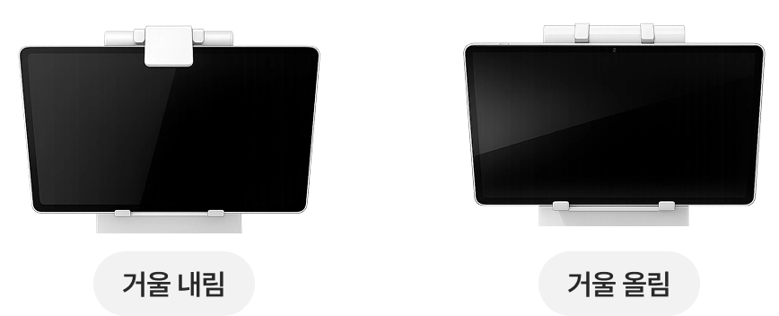 전면이 보이도록 거울을 들어 셀카를 찍거나, 하방이 보이도록 거울을 내려 작품(블록, 그림 등)을 찍을 수 있습니다.