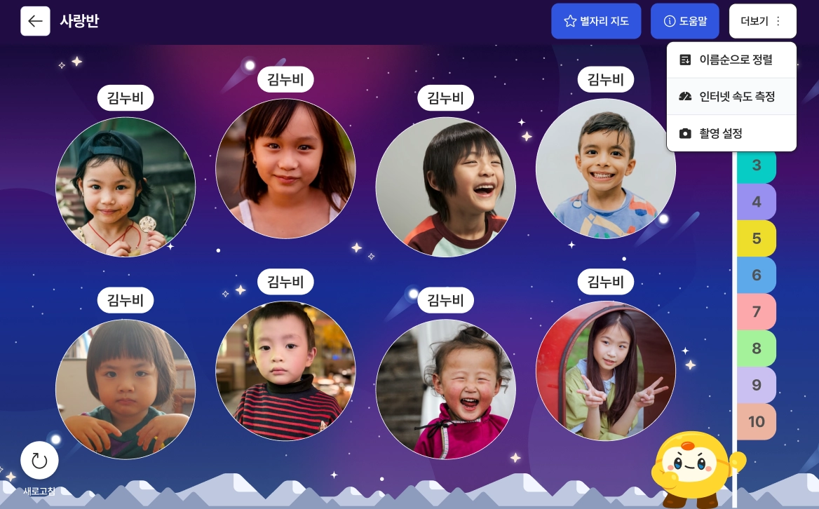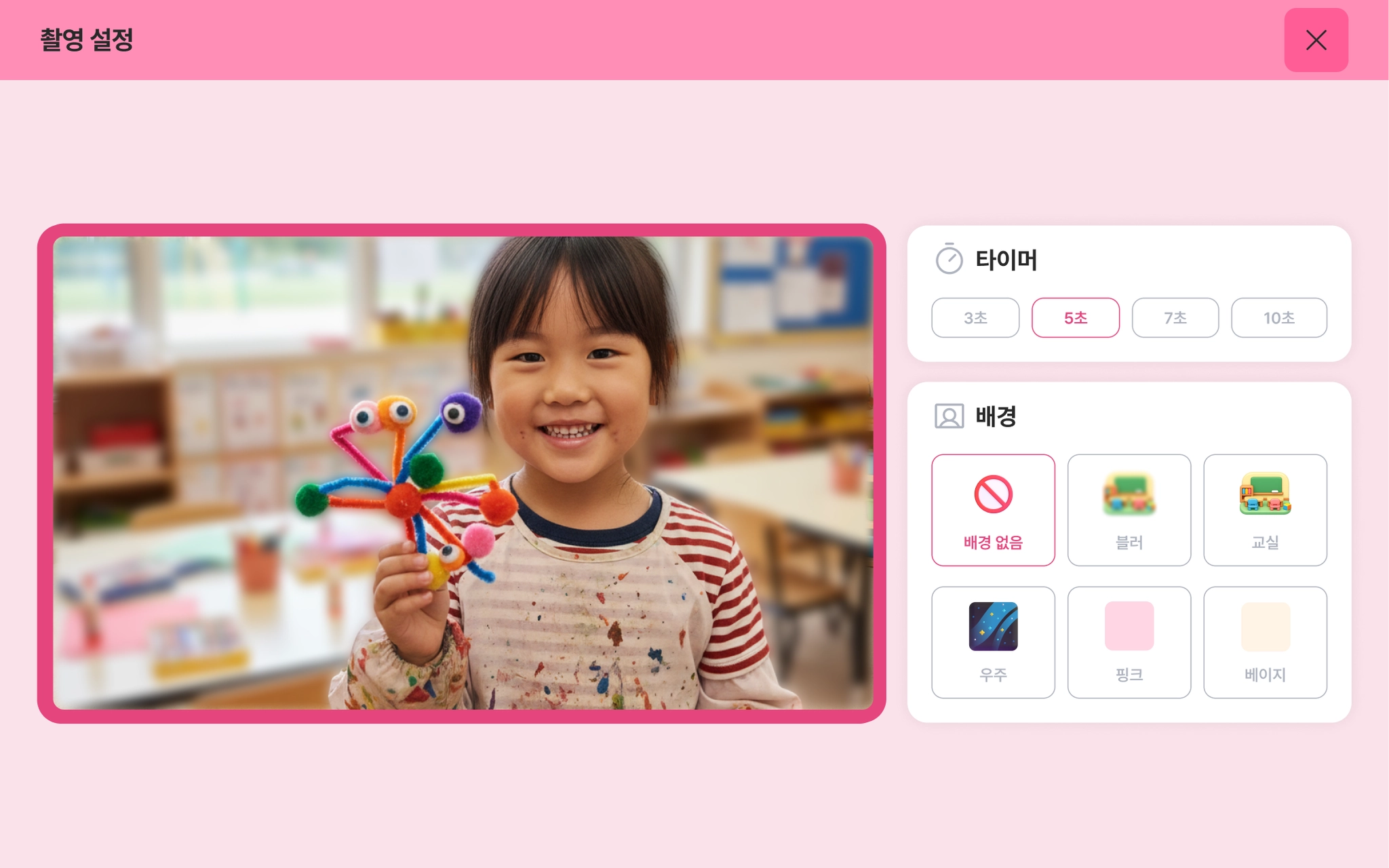 A. [더보기] > [촬영 설정]에서 주변 배경을 가리도록 설정(블러 / 교실 / 단색 / 우주 중 선택)하실 수 있어요. 냠냠플레이 v2.13 이상을 설치하시면 해당 기능을 사용하실 수 있습니다!