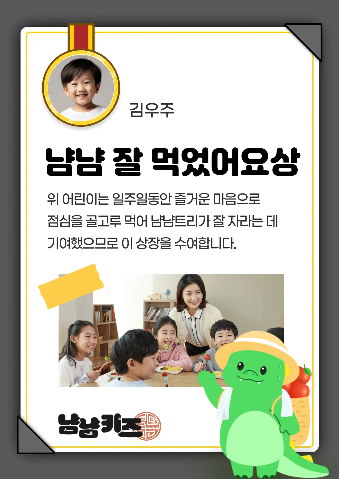 아이들의 식습관을 더욱즐겁게 개선할 수 있도록 냠냠키즈에서 새로 출시한 신규 프로그램이에요. 잘 먹었을 때 보상을 주는 칭찬스티커에서 영감을 얻었어요!