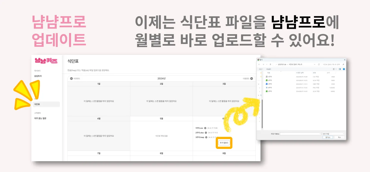 이제 냠냠프로에 식단표 파일을 바로 업로드할 수 있어요!