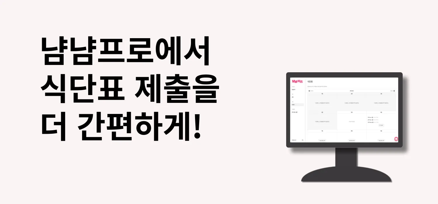 식단표 제출 방식이 더 간편해졌습니다. 기존과 똑같이 냠냠프로에 접속하여 식단표를 제출해주시면 되는데요, 기존에는 별도의 링크에서 파일을 업로드했다면 이제는 냠냠프로에 직접 업로드하실 수 있게 되었어요:)