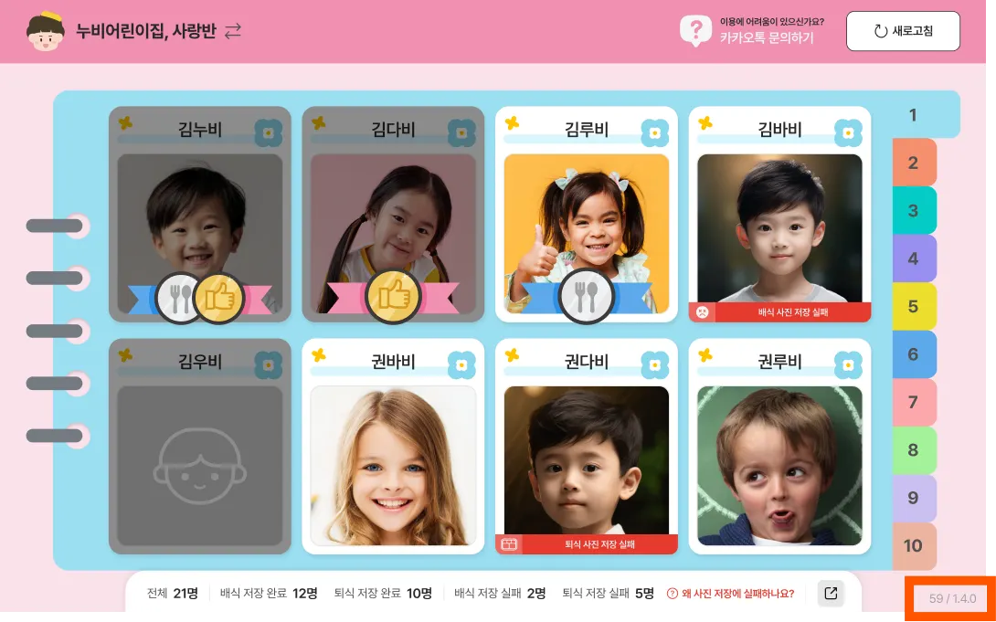 직접 조치를 시도해보았음에도 지속적으로 동일한 문제가 발생한다면, 아래 정보와 함께 냠냠키즈 선생님 카카오톡 채널로 문의 내용을 남겨주세요! 최대한 빠르게 응대하도록 하겠습니다!