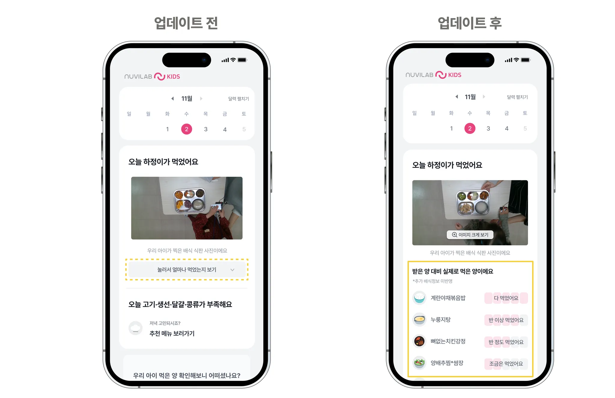 업데이트 전에는 눌러서 얼마나 먹었는지 보기 버튼을 눌러야 섭취율을 확인할 수 있었지만, 이제는 버튼을 누르지 않아도 바로 섭취율을 확인할 수 있게 되었어요!