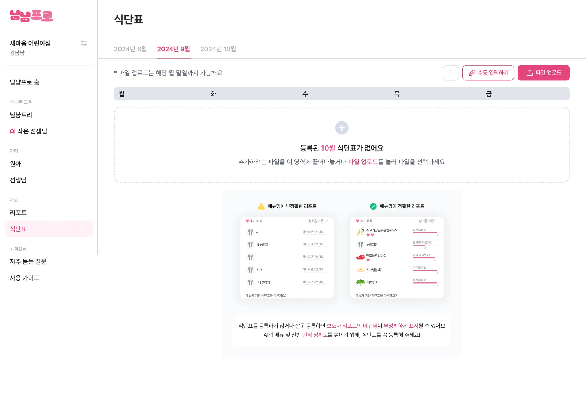 잊지 않고 식단표를 제출하실 수 있도록 매달 알림톡을 통해 안내드리고 있으니, 바쁘시더라도 꼭 제출 부탁드려요