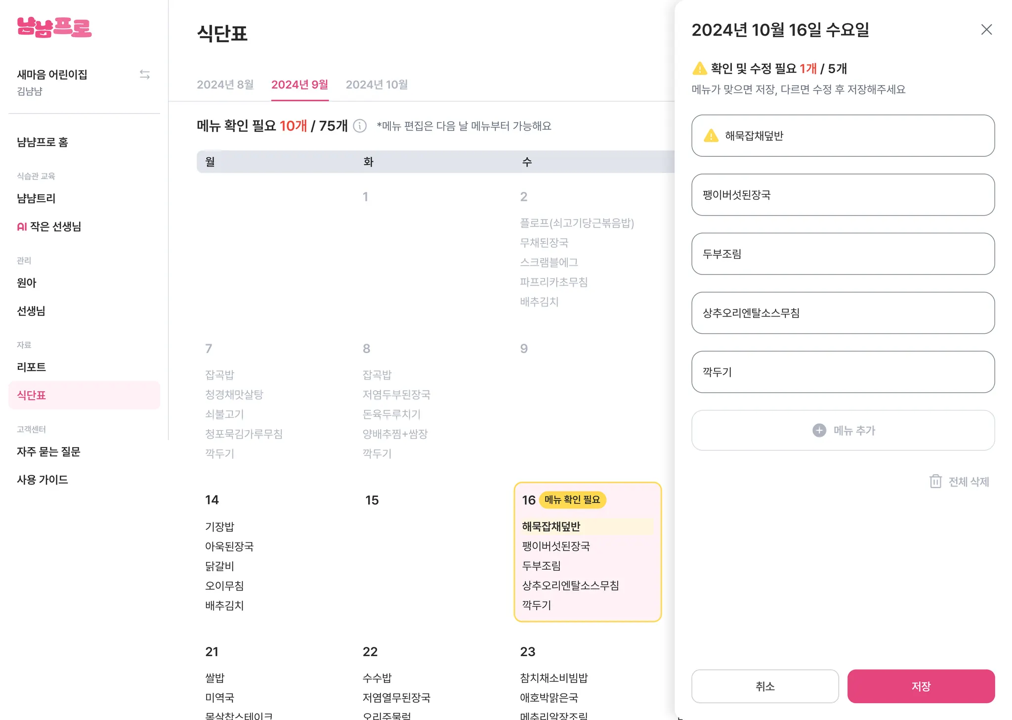 실제 식단표와 메뉴가 맞으면 저장을, 메뉴가 다르면 수정 후 저장 을 선택해주세요.
