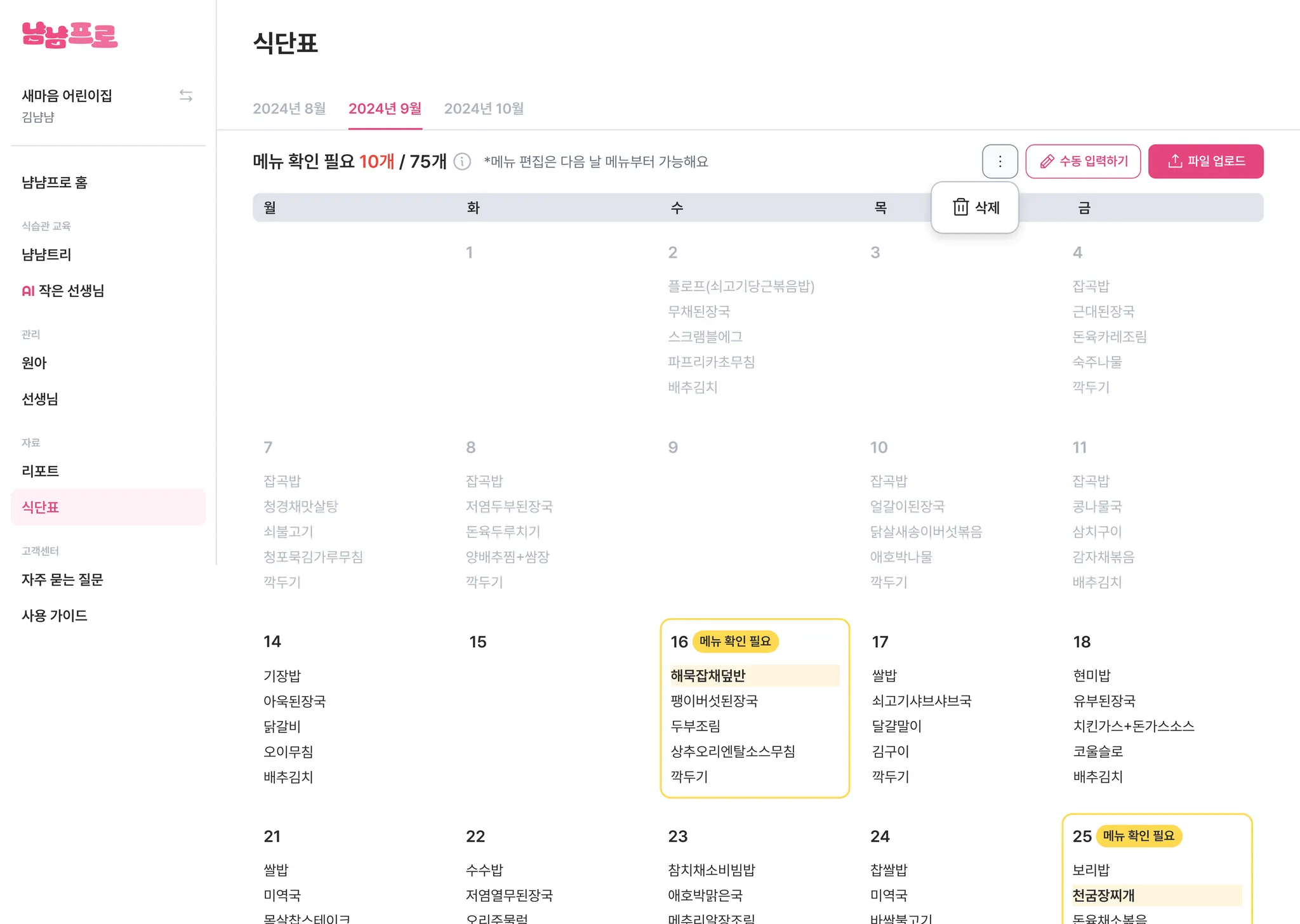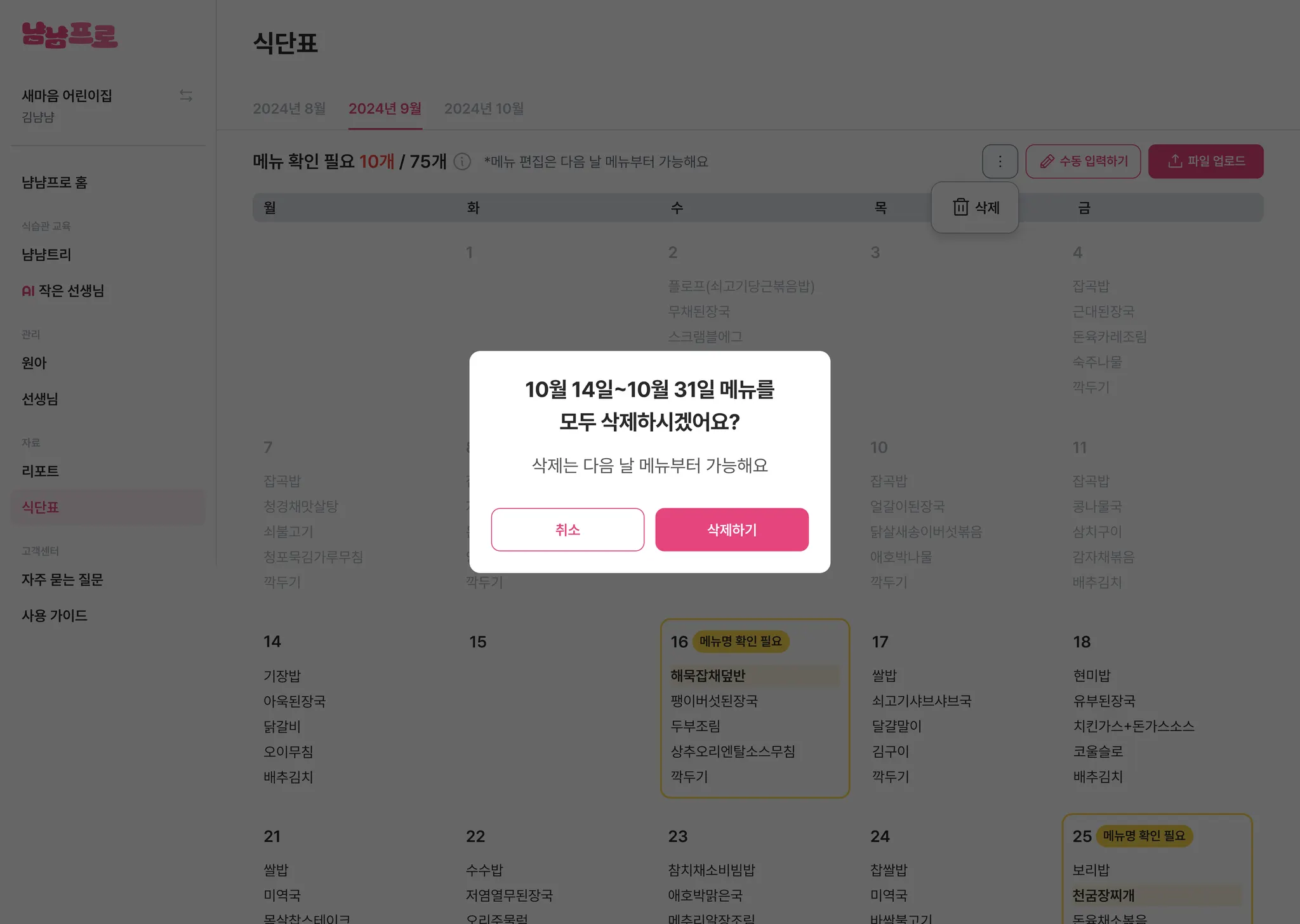삭제를 눌러주시면 이미 지난 날짜와 당일을 제외한 모든 날짜의 메뉴가 삭제돼요.