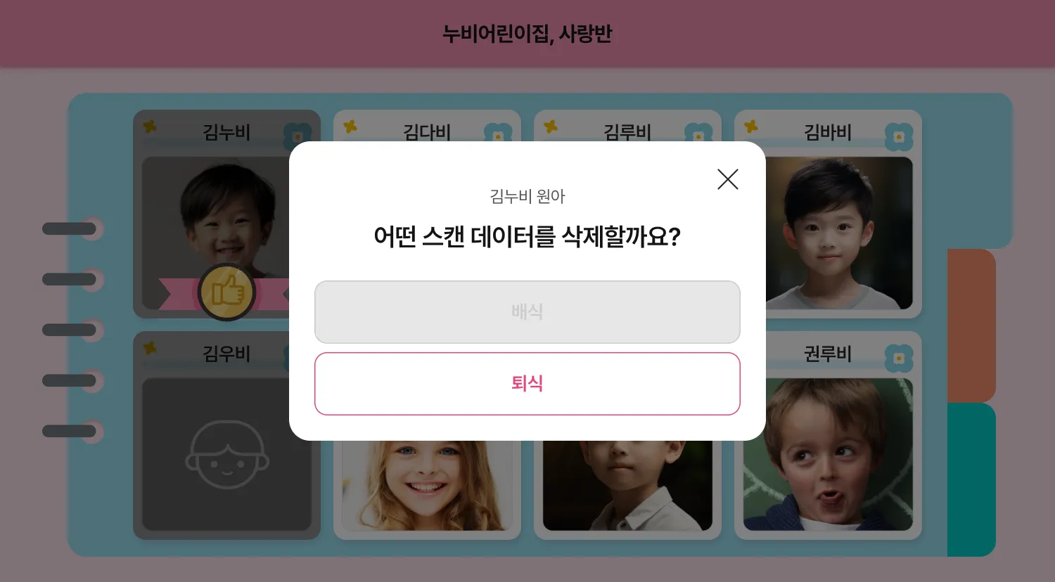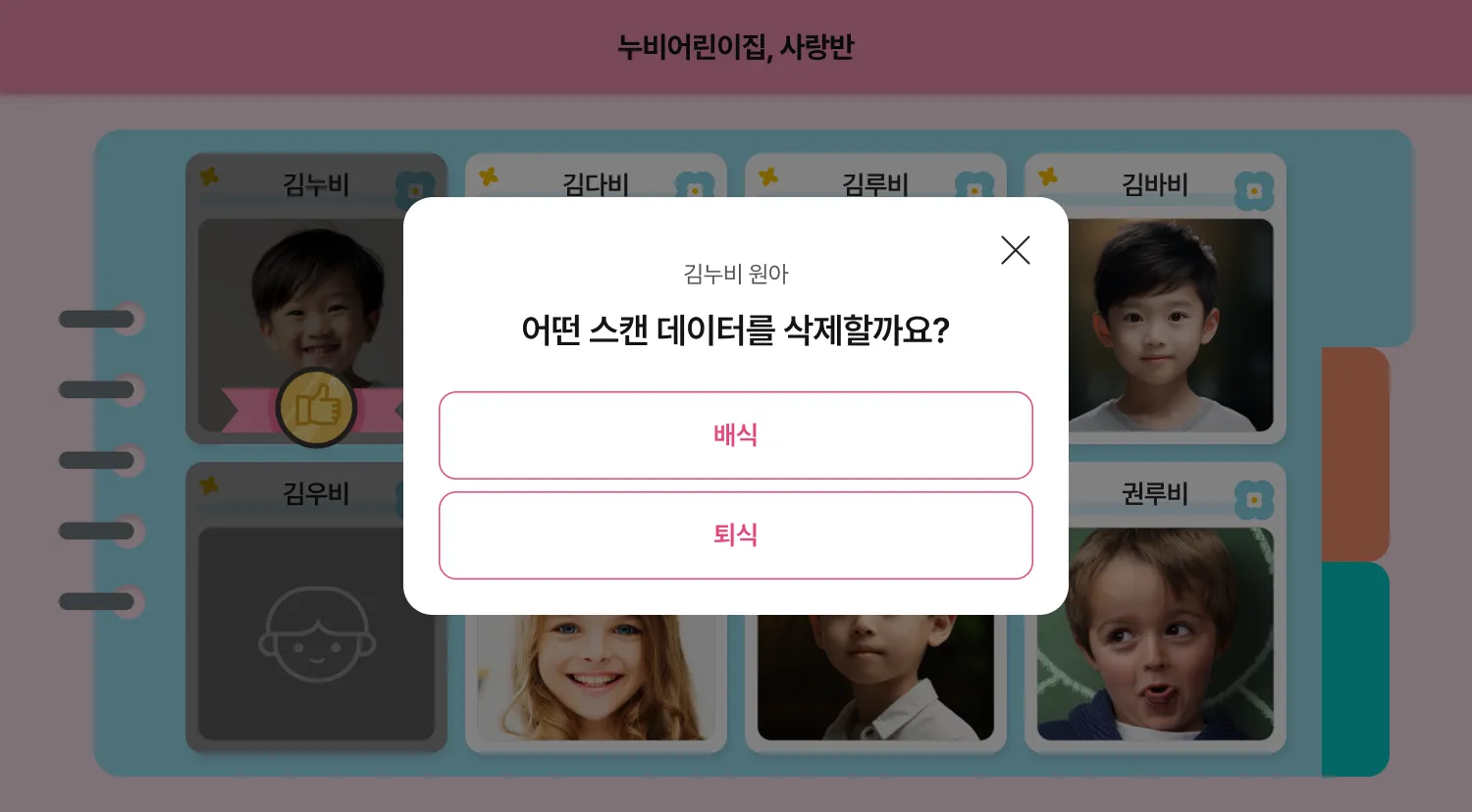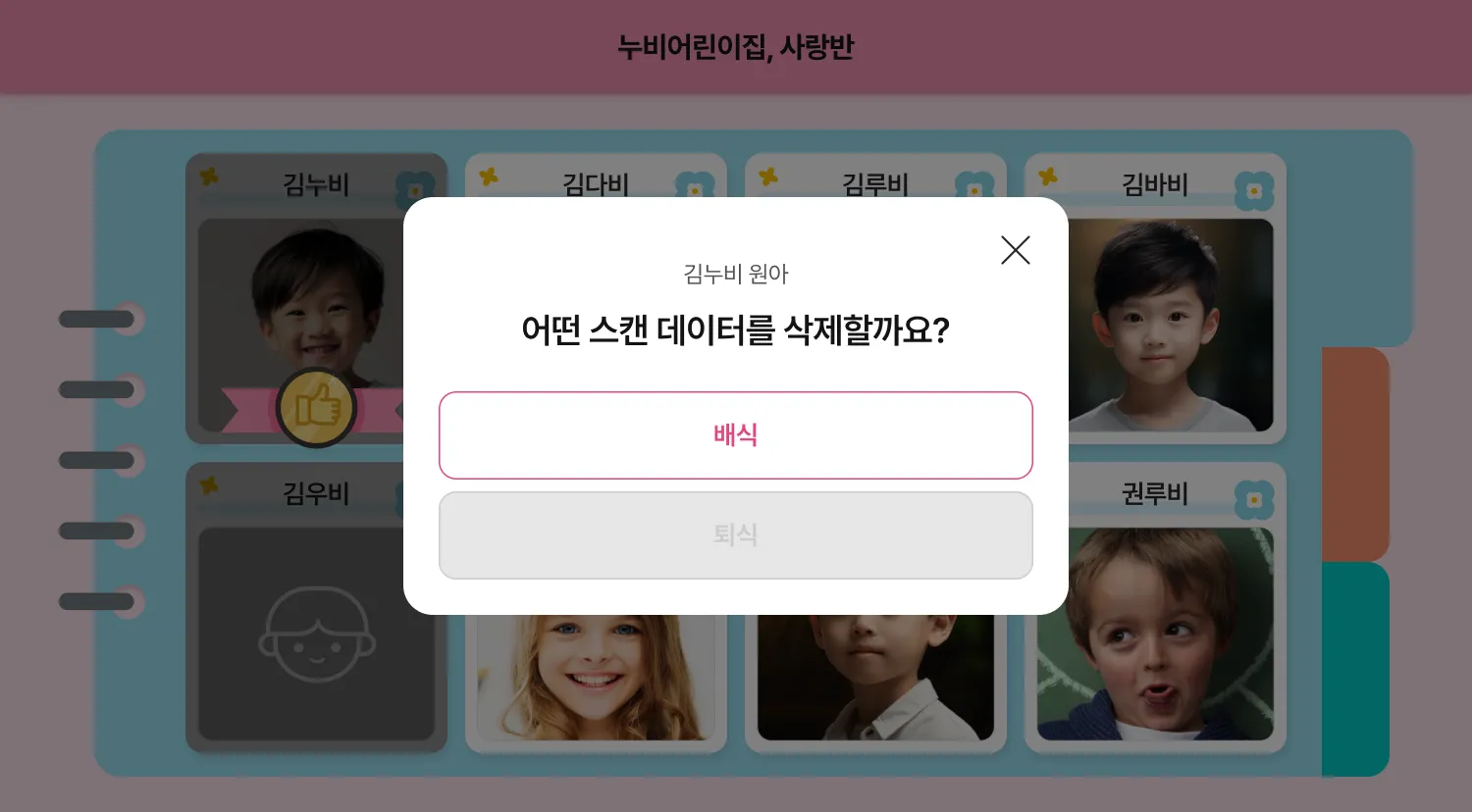 촬영한 데이터가 있는 원아 카드를 2초정도 꾹 눌러주시면, 스캔 취소 팝업이 보여질 거예요. 해당 팝업에서 삭제할 데이터를 선택해 주세요.