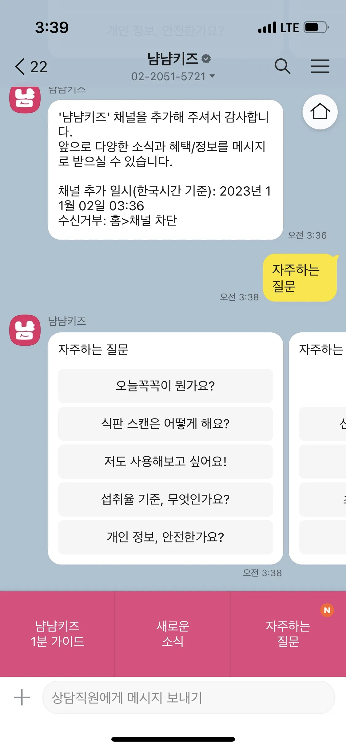 보호자님들이 매일 보시는 냠냠키즈의 카카오톡 채널이 개선되었어요!