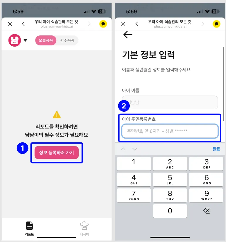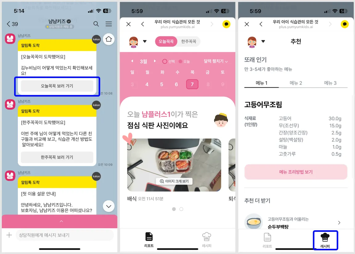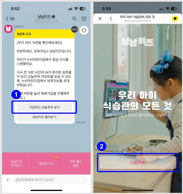 회원가입을 완료하셨으면 이제 매일 오는 오늘꼭꼭 메시지를 보고 냠냠키즈에 접속하여 리포트를 확인하시면 돼요!