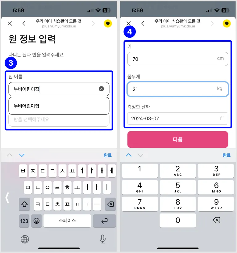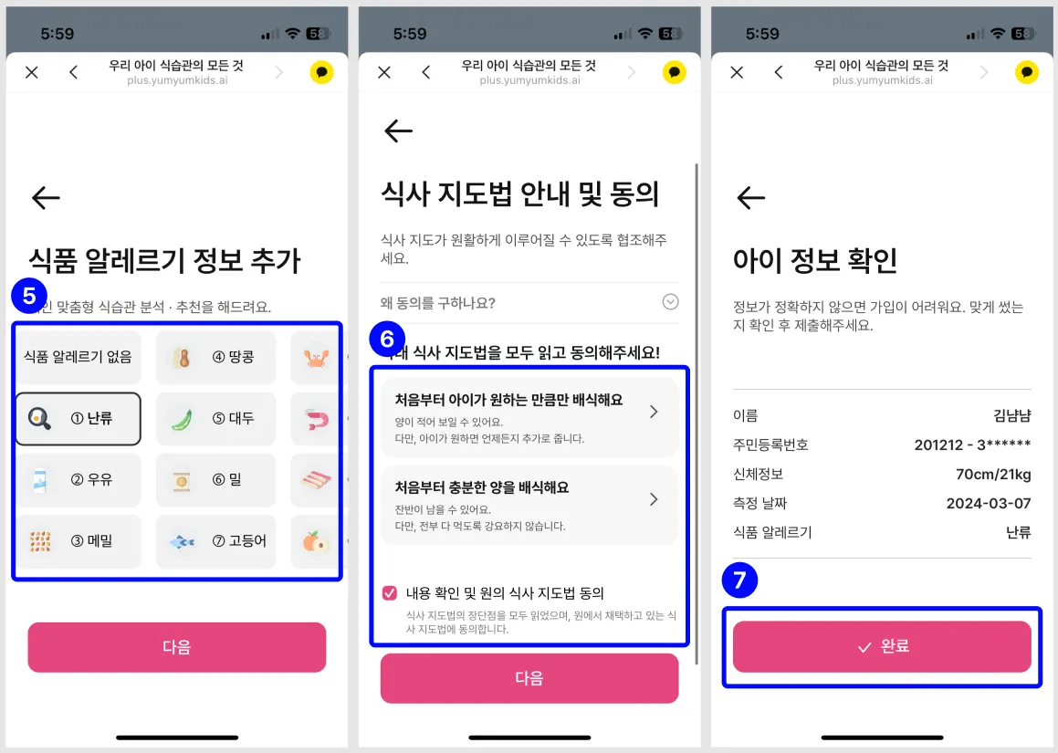 생년월일과 성별 > 재원 중인 기관과 반 이름 > 키/몸무게 > 식품 알레르기를 입력해주세요.