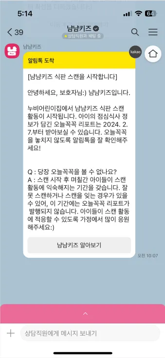 기관에서 아이가 식판 스캔 활동을 시작하면 서비스 이용에 동의하신 보호자님들께 스캔 활동이 시작되었다는 안내를 담은 카카오톡 메시지가 발송돼요.