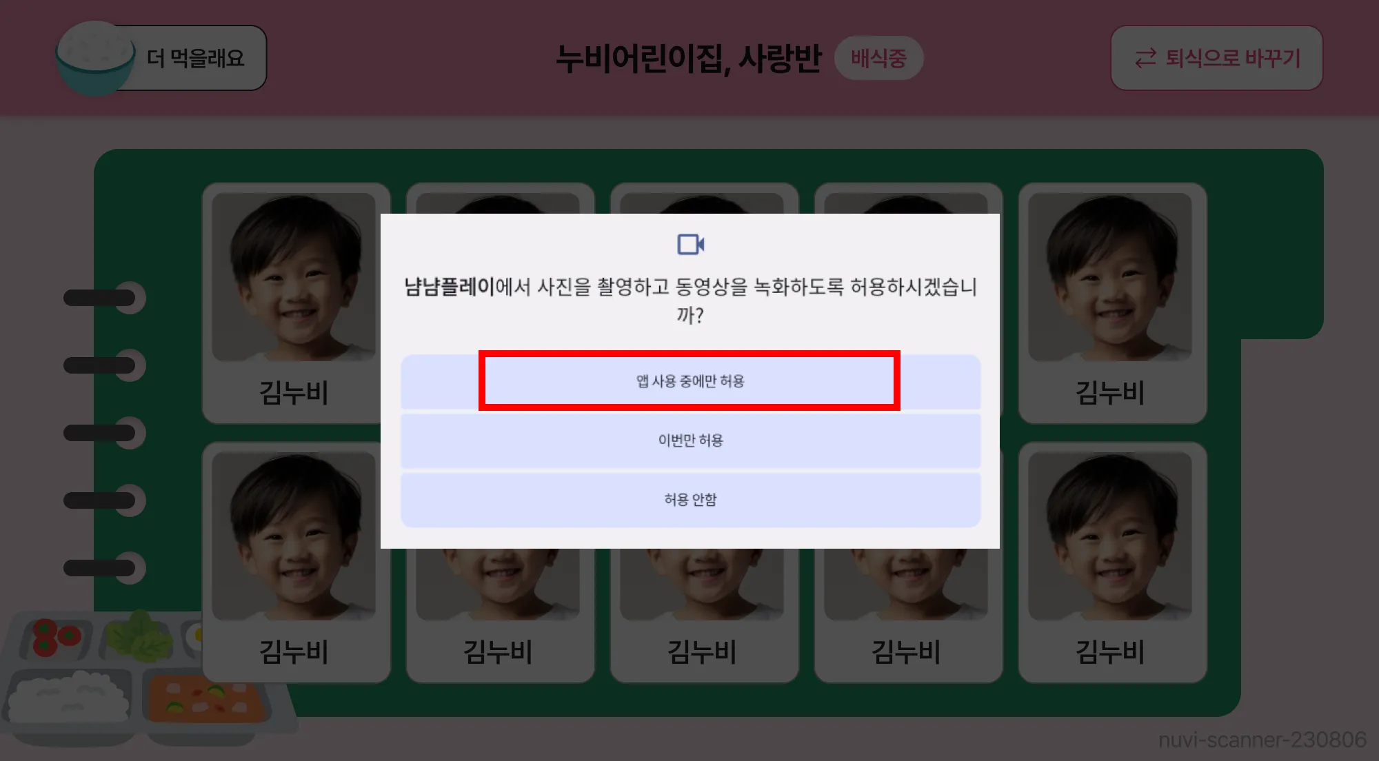 식판 스캔을 위해 카메라 접근 허용을 앱 사용 중에만 허용 으로 설정해주세요.