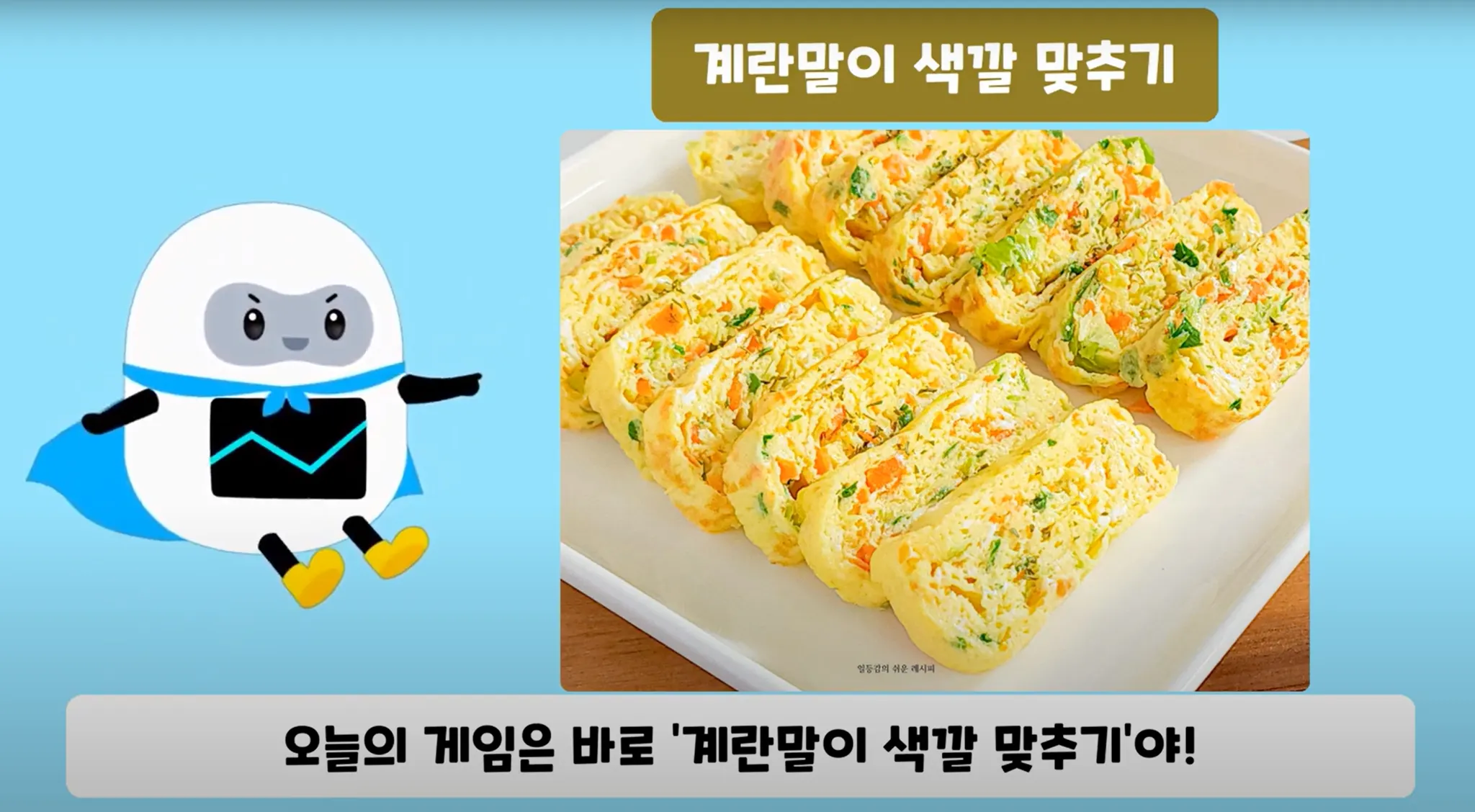 영상 속 AI 작은 선생님이 당일 제공되는 점심 메뉴를 소개하고, 그 중 편식할 확률이 높은 메뉴에 대해 미션을 제공해요
