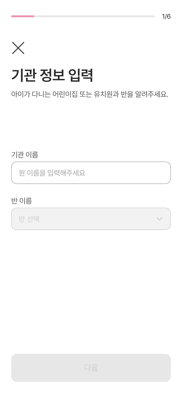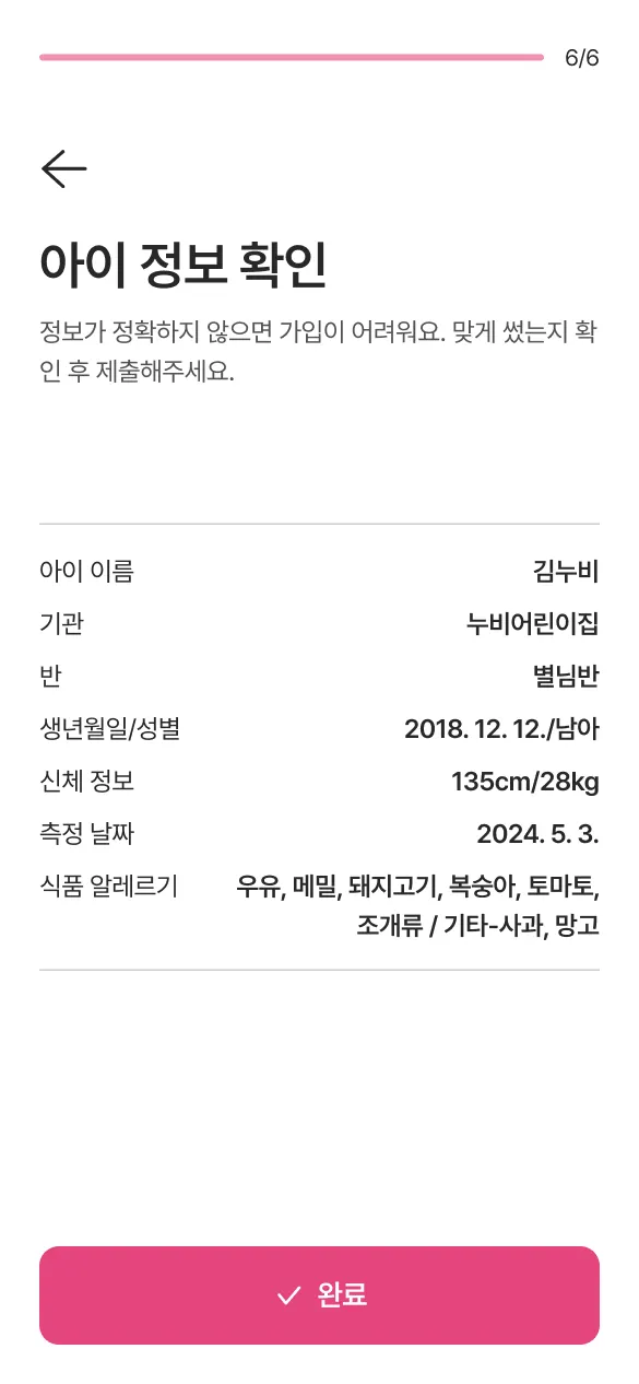 생년월일과 성별 > 재원 중인 기관과 반 이름 > 키/몸무게 > 식품 알레르기를 입력해주세요.