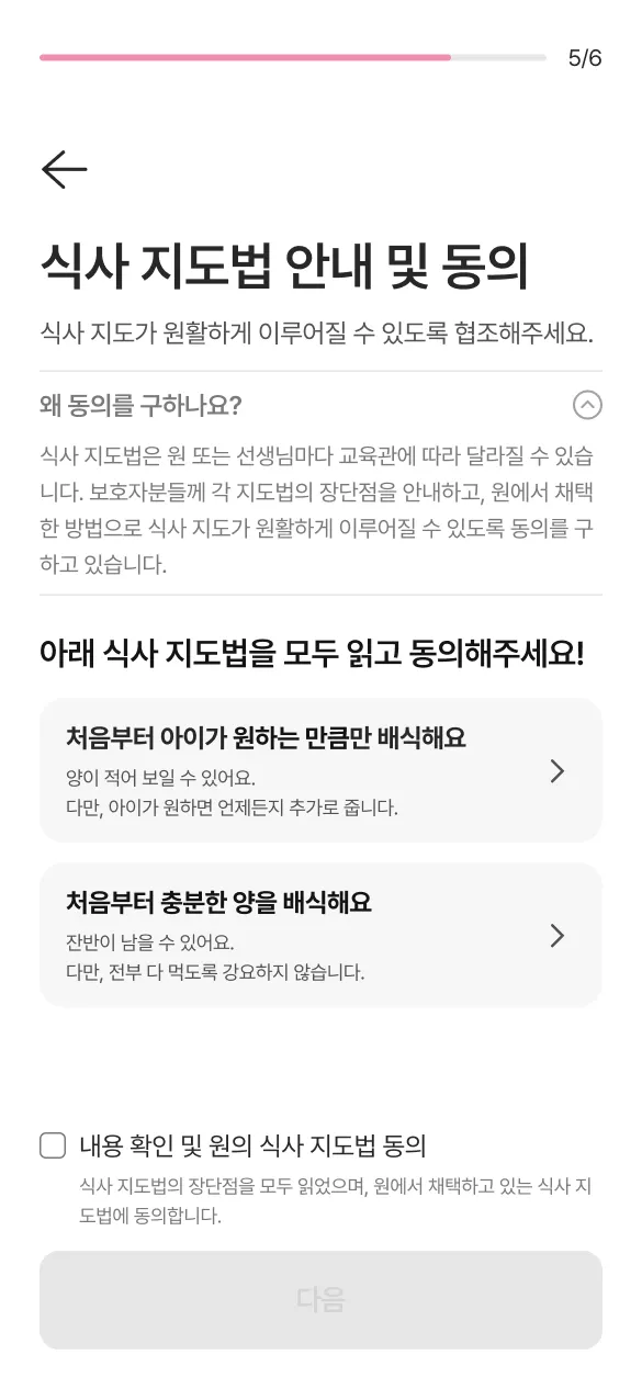 기관에서 제공하는 식사 지도법에 대한 안내를 읽고 동의해주세요.