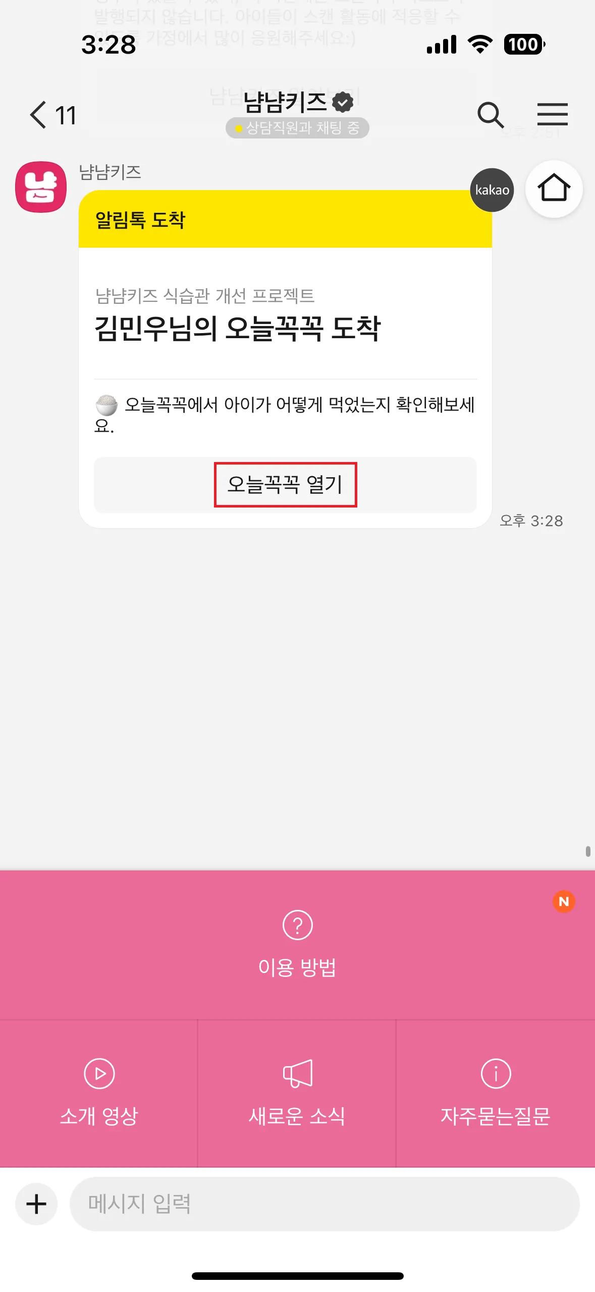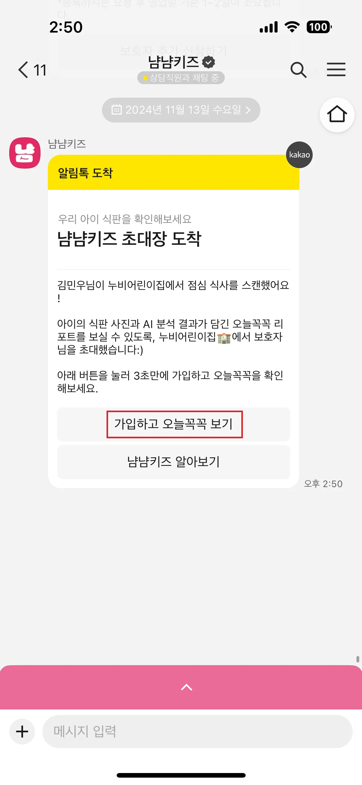리포트 발송 시작일이 되면, 냠냠키즈가 보호자님들께 회원 가입을 요청하는 알림톡을 보내드려요.