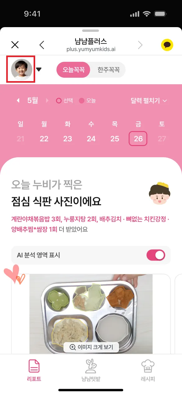 여러 명의 아이를 가진 보호자는 좌측 상단의 프로필 사진을 선택하여 아이 간 전환을 하실 수 있어요!