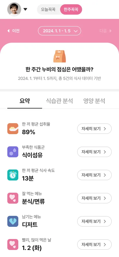 한 주 동안 아이가 어떻게 먹었는지 그래프로 살펴보고 다른 아이들과 비교해보며 부족한 부분을 보충할 수 있어요!